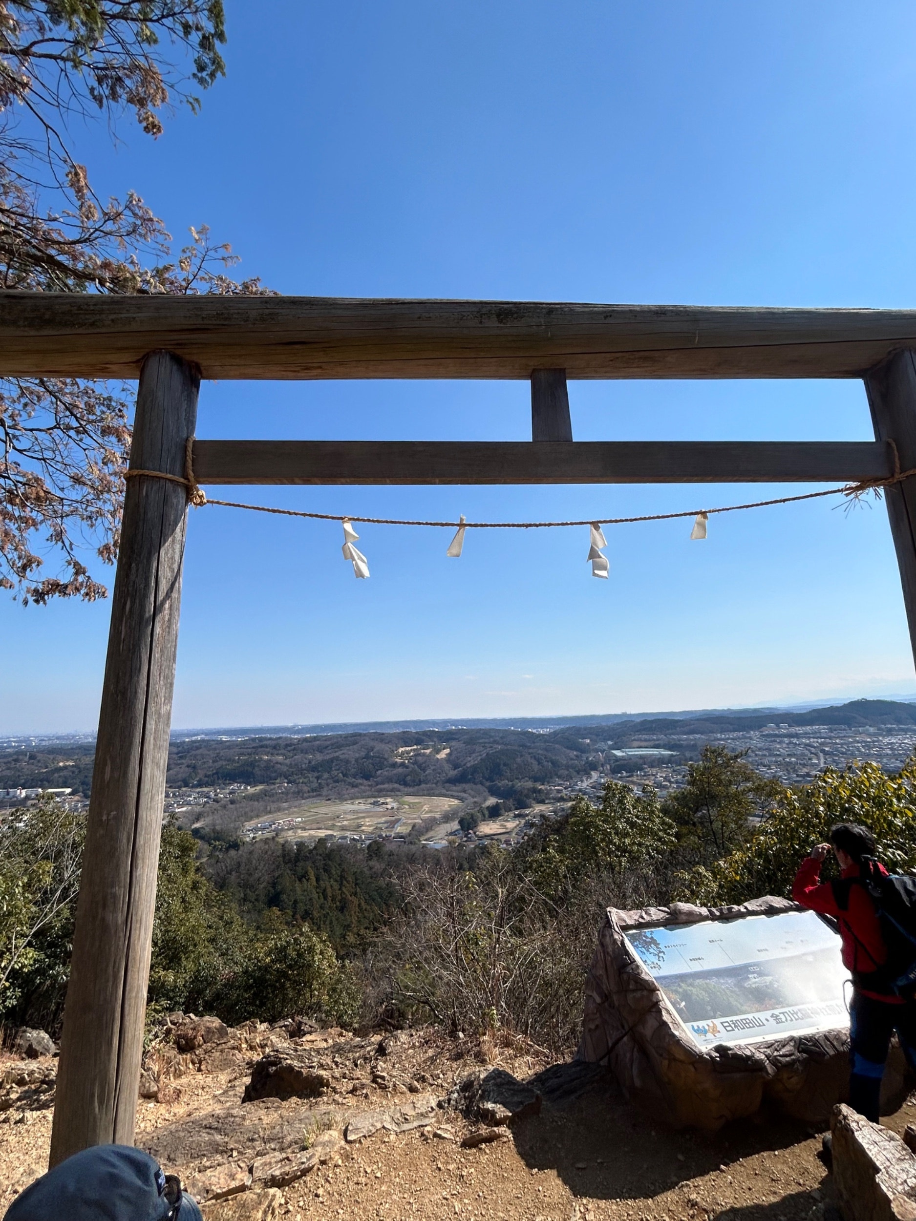 鳥居から覗いた左側中間のまぁるい平地が、曼珠沙華で有名な巾着田です!