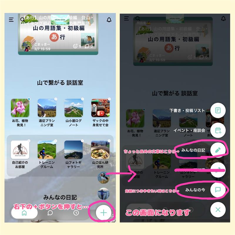ちょっと長めの文章やたくさんの写真をアップしたい場合【みんなの日記 】から投稿してみましょう。